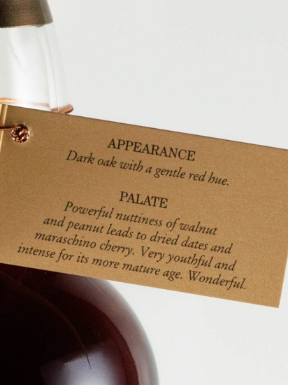 口に含むとクルミやピーナッツの芳ばしくナッティな味わい、続いてドライデーツの凝縮したねっとりとした甘み、マラスキーノチェリーで、熟成年数以上の複雑さと力強さも併せ持った味わいがお楽しみいただけます。