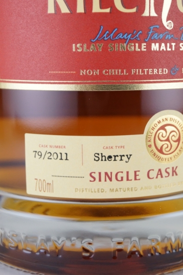 キルホーマン2011 シェリーバットはアイラ島産ピートをたっぷりと焚き込んだフェノール値50ppmのヘビーピーテッド麦芽を使用し、シェリーバットで5年熟成。