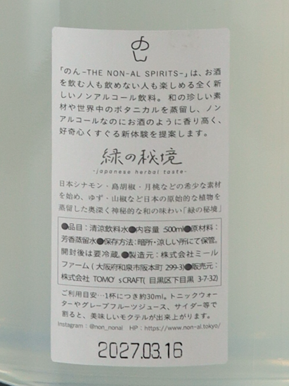 「ノンアルコールスピリッツ 緑の秘境」は、日本シナモン・島胡椒などの希少な素材を始め、ゆず・山椒など日本の原始的な植物を蒸留した奥深く神秘的な和の味わい。ご使用の際は、1杯につき30mlほどご使用いただくのを推奨。1本につき、ドリンクを15-20杯ほど作れます。