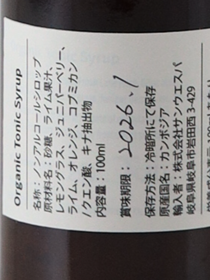 原材料:水、砂糖、ライム果汁、クエン酸、天然香料(レモングラス、ジュニパーベリー、ライム、オレンジ、キナ、コブミカン)